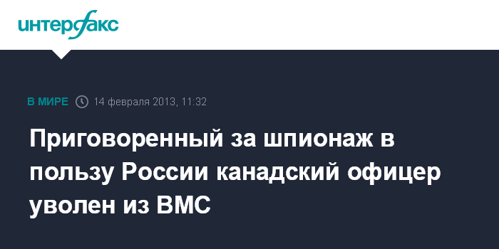 Оттава. 14 февраля. INTERFAX.RU - Министерство обороны Канады приняло решение уволить из вооруженных сил офицера канадских ВМС Джеффри Дилайла, приговоренного к 20 годам тюрьмы за шпионаж в пользу России, говорится в заявлении оборонного ведомства. Дилайл также лишен офицерского звания и военных наград, отмечается в заявлении.