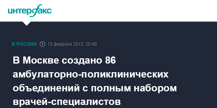 Москва. 13 февраля. INTERFAX.RU - В Москве в рамках программы модернизации и реорганизации объектов системы здравоохранения создано 86 амбулаторно-поликлинических объединений, заявил руководитель столичного департамента здравоохранения Георгий Голухов