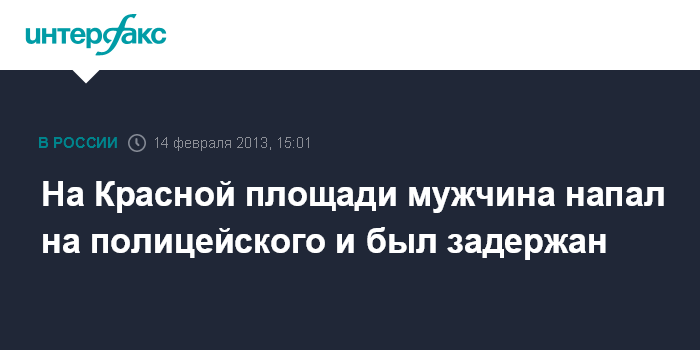 Москва. 14 февраля. INTERFAX.RU - На Красной площади в Москве задержан мужчина с бейсбольной битой, который набросился на сотрудника полиции, сообщили "Интерфаксу" в пресс-службе столичного главка МВД.