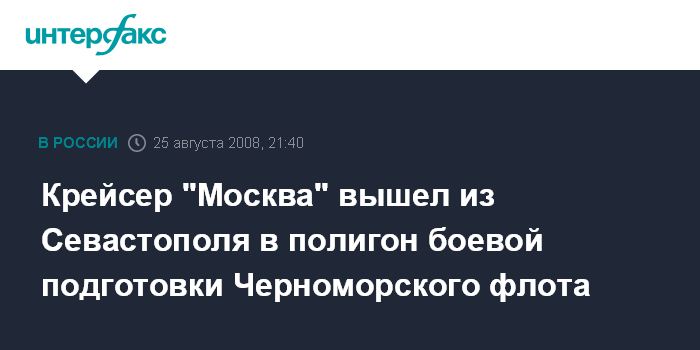 Москва. 25 августа. ИНТЕРФАКС - Ракетный крейсер Черноморского флота России "Москва" вышел в понедельник из Севастополя.