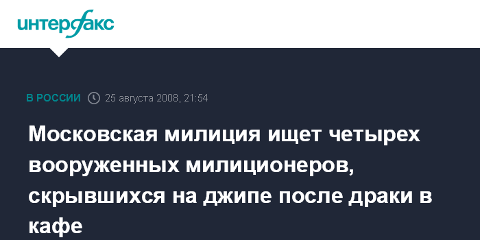 Москва. 25 августа. ИНТЕРФАКС-МОСКВА - В Москве объявлен специальный план "Перехват" по поиску вооруженных милиционеров, подозреваемых в преступлении в связи с дракой в московском кафе.