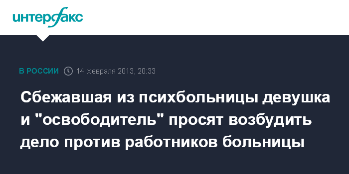 Москва. 14 февраля. INTERFAX.RU - Молодой человек и девушка, сбежавшая при его помощи из психиатрической больницы имени Ганнушкина во вторник, просят привлечь к уголовной ответственности причастных к ее незаконному удержанию в лечебнице, сообщили "Интерфаксу" в четверг в пресс-службе ГУ МВД России по Москве.