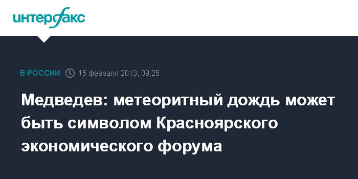 "Я посмотрел сегодня, наверное, коллеги уже обратили внимание, над Челябинской областью, в Тюмени и в некоторых других местах прошел метеоритный дождь. Это еще один символ, может быть, нашего форума. Надеюсь, что последствий серьезных не будет", - заявил Медведев в ходе обмена мнениями на Красноярском экономическом форуме.