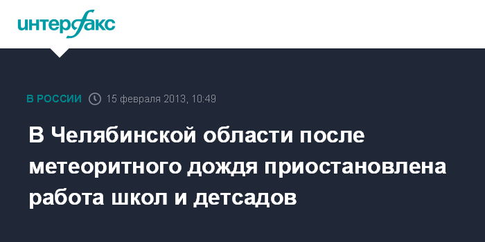 Москва. 15 февраля. INTERFAX.RU- В Челябинской области после падения метеорита выбиты стекла во многих зданиях, решено отменить занятия в школах и детских садах, сообщил руководитель Роспотребнадзора, главный государственный санитарный врач РФ Геннадий Онищенко.