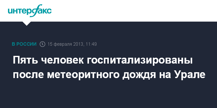 Москва. 15 февраля. INTERFAX.RU - Пять человек доставлены в больницы с травмами, вызванными последствиями падением метеорита в Челябинской области, заявил в эфире канала "Россия-24" начальник Национального центра управления в кризисных ситуациях МЧС РФ Владимир Степанов.