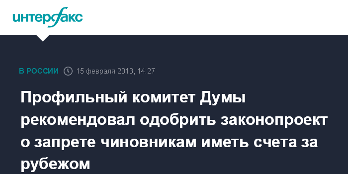 Москва. 15 февраля. INTERFAX.RU - Комитет Госдумы по конституционному законодательству и госстроительству на заседании в пятницу рекомендовал Госдуме 22 февраля рассмотреть в первом чтении президентский законопроект о внесении поправок в закон "О правительстве РФ", которыми вводится запрет чиновникам иметь счета за рубежом.