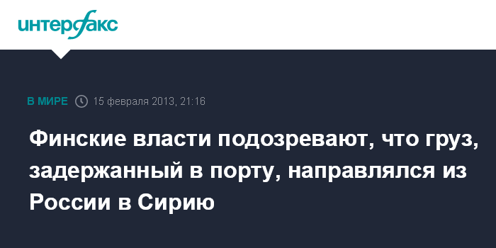 Ранее местные СМИ сообщили, что таможня Финляндии задержала груз запасных частей для танков, который направлялся из России в Сирию. По их данным, груз был обнаружен 8 февраля в контейнере на финском сухогрузе M/S Finnsun.
