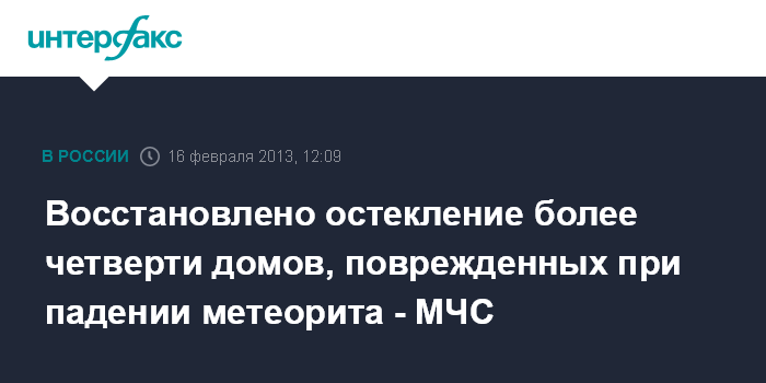 Москва. 16 февраля. INTERFAX.RU - Строители на Урале восстановили остекление более тысячи жилых домов и около сотни социально значимых объектов, поврежденных при падении метеорита, сообщили "Интерфаксу" в субботу в управлении информации МЧС РФ.