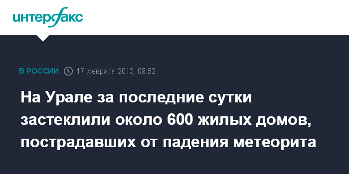 Челябинск. 17 февраля. INTERFAX.RU - На Урале восстановлено остекление 1 тыс. 758 объектов, пострадавших от падения метеорита в пятницу, сообщает пресс-центр ГУ МЧС РФ по региону в воскресенье.