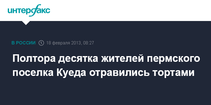 Пермь. 18 февраля. INTERFAX.RU - Полицейские и сотрудники Роспотребнадзора Пермского края выясняют причину массового пищевого отравления в поселке Куеда, жители которого в минувшие выходные обратились в больницы после покупки тортов.