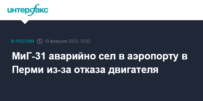 Пермь. 18 февраля. INTERFAX.RU - В аэропорту авиабазы "Сокол" в Перми в понедельник утром совершил аварийную посадку самолет МиГ-31, сообщил агентству "Интерфакс-Поволжье" источник в правоохранительных ведомствах.