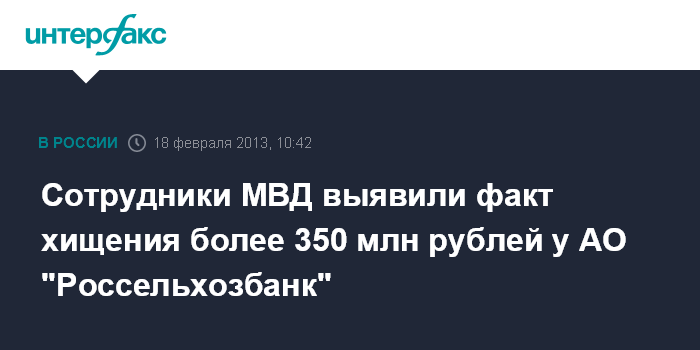 Сотрудники МВД выявили факт хищения более 350 млн рублей у АО "Россельхозбанк"