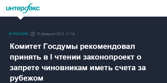 Москва. 18 февраля. INTERFAX.RU - Комитет Госдумы по безопасности на заседании в понедельник рекомендовал нижней палате парламента принять в первом чтении президентский законопроект, запрещающий чиновникам иметь счета за рубежом.