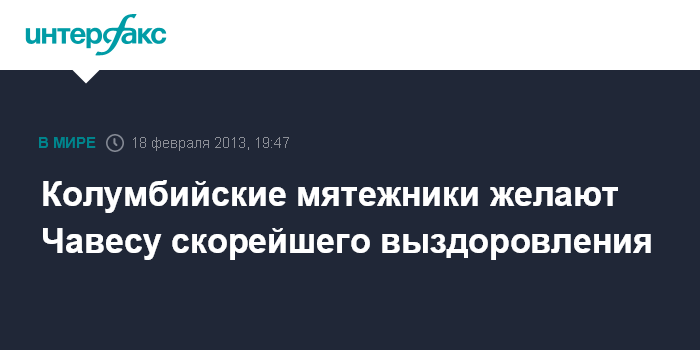 Гавана. 18 февраля. INTERFAX.RU - Мятежники из Революционных вооруженных сил Колумбии (РВСК) в понедельник пожелали венесуэльскому президенту Уго Чавесу скорейшего выздоровления, сообщает агентство EFE.