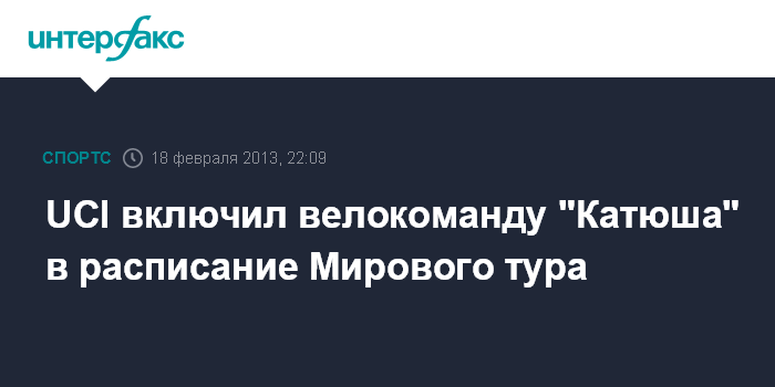 Москва. 18 февраля. INTERFAX.RU- Международный союз велосипедистов (UCI) объявил, что российская "Катюша" зарегистрирована 19-й командой, которая будет выступать в сезоне-2013 Мирового тура.