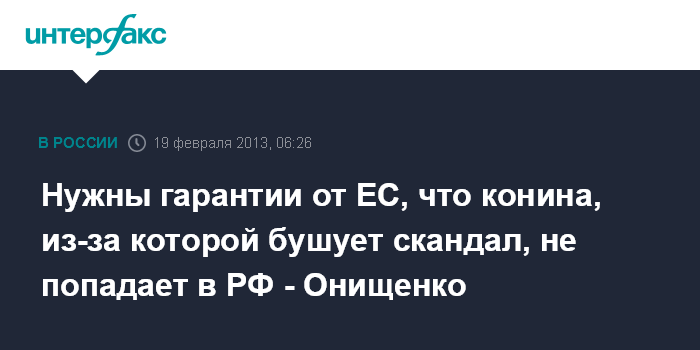 В пятницу Г.Онищенко заявил "Интерфаксу", что проверки Роспотребнадзора пока не обнаружили в российских торговых сетях мясной продукции с кониной, из-за которой бушует скандал в Европе.
