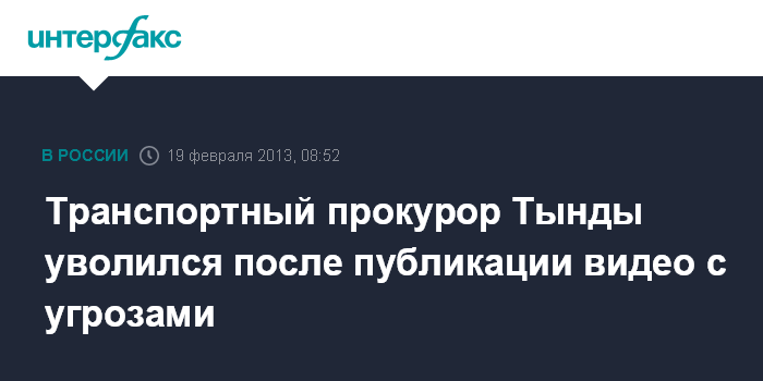Хабаровск. 19 февраля. INTERFAX.RU - Транспортный прокурор Тынды Алексей Токарев уволен по собственному желанию после опубликования скандального видеоролика в Интернете.