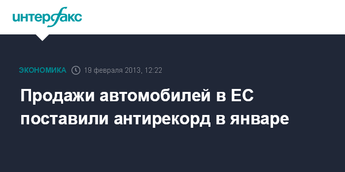 Брюссель. 19 февраля. INTERFAX.RU - Продажи новых автомобилей в 27 странах Европейского союза снизились в январе 2013 года на 8,7% по сравнению с тем же месяцем 2012 г. - до 885,159 тыс. штук, говорится в сообщении Европейской ассоциации производителей автомобилей (ACEA).