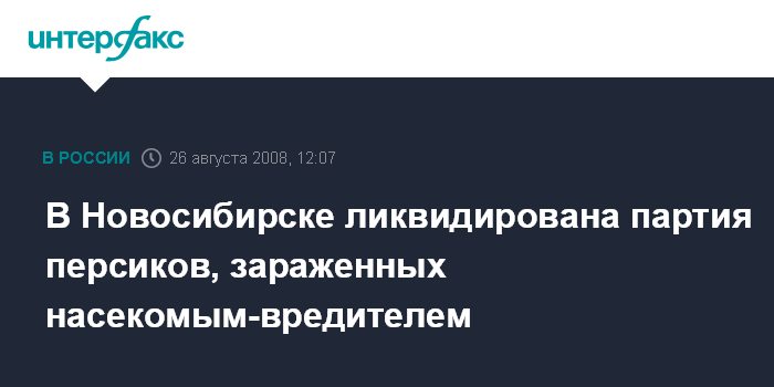 Москва. 26 августа. INTERFAX.RU - Почти два центнера персиков, зараженных вредителем "восточной плодожоркой", уничтожены сотрудниками Россельхонадзора по Новосибирской области.