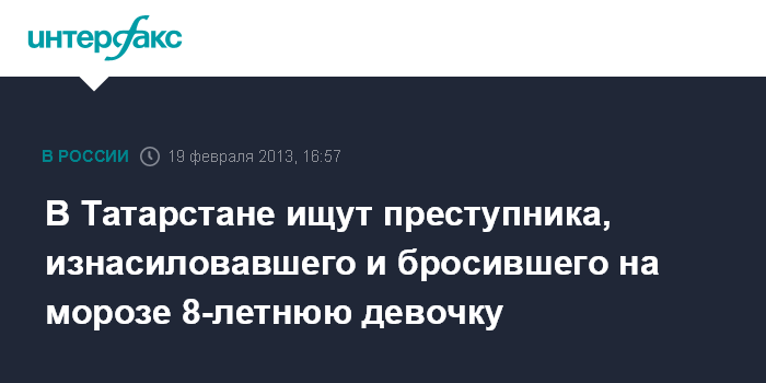 Москва. 19 февраля. INTERFAX.RU - Правоохранительные органы Татарстана разыскивают преступника, изнасиловавшего и бросившего на морозе 8-летнюю девочку из Елабуги, сообщили в Следственном комитете РФ.
