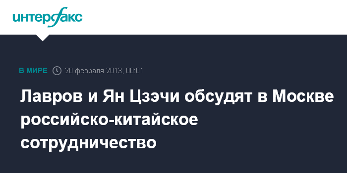 Москва. 20 февраля. INTERFAX.RU - Главы внешнеполитических ведомств России и Китая обсудят подготовку встреч на высшем уровне в этом году в ходе переговоров в Москве 20-22 февраля.