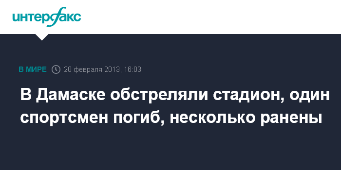 Бейрут. 20 февраля. INTERFAX.RU - Один игрок сирийской футбольной команды "Ватба" был убит и еще несколько получили ранения в результате минометного обстрела в среду стадиона в Дамаске.