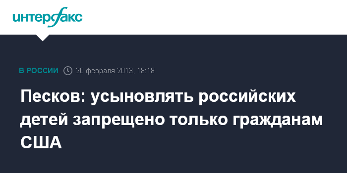 По его словам, запрет на усыновление существует только для граждан США, это связано с тем, что российские органы испытывают существенные трудности с последующим контролем условий пребывания усыновленных детей на территории США. "Таких проблем с другими странами нет, из этого мы исходим", - заявил Песков журналистам.
