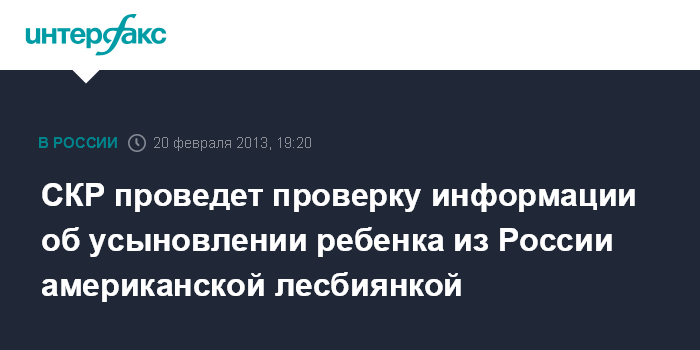 Москва. 20 февраля. ИНТЕРФАКС - Следственный комитет России проверит сообщения СМИ об усыновлении гражданкой США, состоящей в однополом браке, российского ребенка, сообщил "Интерфаксу" официальный представитель СК РФ Владимир Маркин.