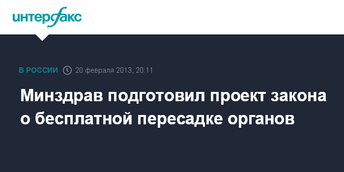 Москва. 20 февраля. INTERFAX.RU - Законопроект о трансплантации, подготовленный министерством здравоохранения России, предусматривает бесплатную пересадку органов, сообщила глава ведомства Вероника Скворцова.