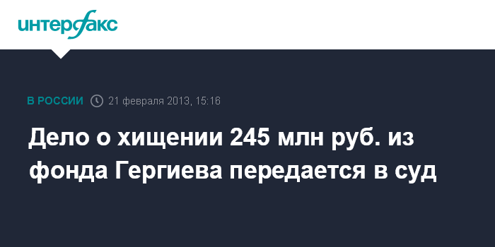 Москва. 21 февраля. INTERFAX.RU - Генеральная прокуратура России направила в суд уголовное дело, возбужденное по факту хищения 245 млн рублей из благотворительного "Фонда Валерия Гергиева".