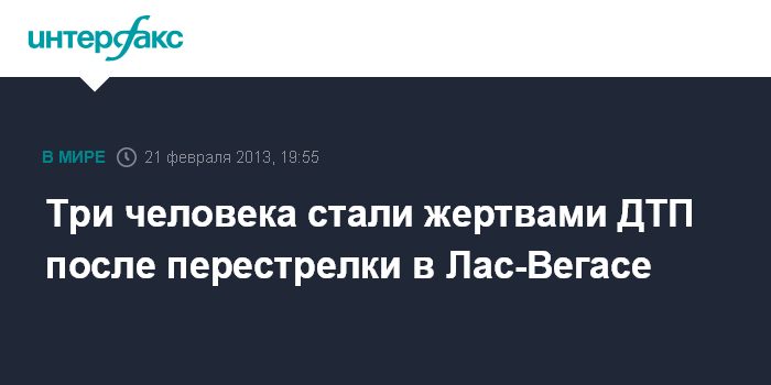 Вашингтон. 21 февраля. INTERFAX.RU - По меньшей мере три человека погибли, еще трое получили ранения в результате перестрелки, которая привела к автомобильной аварии в центре Лас-Вегаса.