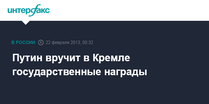 Москва. 22 февраля. ИНТЕРФАКС - Президент России Владимир Путин в пятницу вручит в Кремле государственные награды видным деятелям науки, культуры, искусства, военным, спортсменам, религиозным деятелям, педагогам, представителям других профессий.