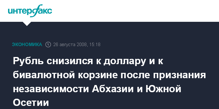 Рубль снизился к доллару и к бивалютной корзине после признания независимости Абхазии и Южной Осетии