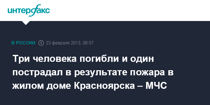 Красноярск. 23 февраля. ИНТЕРФАКС-СИБИРЬ - Двое взрослых и один ребенок погибли в результате пожара в квартире жилого дома в Красноярске, сообщили в субботу агентству "Интерфакс-Сибирь" в оперативном штабе ГУ МЧС России по Красноярскому краю.