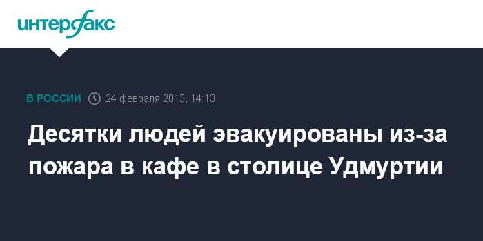 Москва. 24 февраля. INTERFAX.RU - 30 человек эвакуированы из горящего кафе в Ижевске, никто не пострадал, сообщили "Интерфаксу" в управлении МЧС РФ по Удмуртии. "Пожар в кафе "Туран" возник в Ижевске в 13:40 мск. Площадь пожара составляет 300 кв.м. Из горящего здания эвакуировано 30 человек посетителей и персонала, никто не пострадал", - отметили в МЧС.