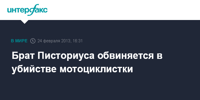 Москва. 24 февраля. INTERFAX.RU - Карл Писториус, брат знаменитого южноафриканского паралимпийца Оскара Писториуса, является фигурантом дела о гибели женщины в автокатастрофе в 2010 году, информирует телеканал eNCA. Адвокат семьи заявил телеканалу, что Карл должен был предстать перед судом в четверг, когда суд рассматривал вопрос, отпускать ли Оскара под залог.