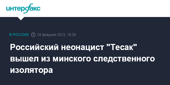 Минск. 24 февраля. ИНТЕРФАКС-ЗАПАД - Российский неонацист Максим Марцинкевич по кличке "Тесак", задержанный 10 дней назад в Минске, отпущен из минского ИВС под обязательство о явке, сообщили агентству "Интерфакс-Запад" в воскресенье в СК Белоруссии.