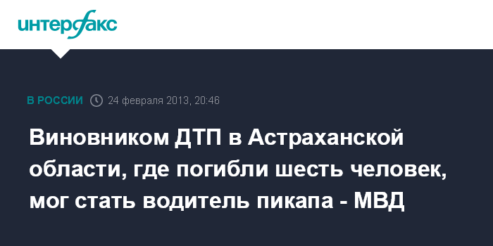 Астрахань. 24 февраля. ИНТЕРФАКС-ЮГ - Автоавария на трассе М-6 в Енотаевском районе Астраханской области, в котором в воскресенье погибли шесть человек, в том числе ребенок, могло произойти по вине выехавшего на встречную полосу водителя пикапа "Мицубиси", сообщили агентству "Интерфакс-Юг" в пресс-службе управления МВД по региону.