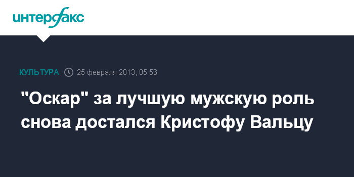 Москва. 25 февраля. INTERFAX.RU – Награду за "Лучшую мужскую роль второго плана" в этом году получил Кристоф Вальц за роль в фильме "Джанго освобожденный". Это второй "Оскар" австрийского актера – первый он получил тоже за роль в фильме Квентина Тарантино "Бесславные ублюдки" в 2010 году.