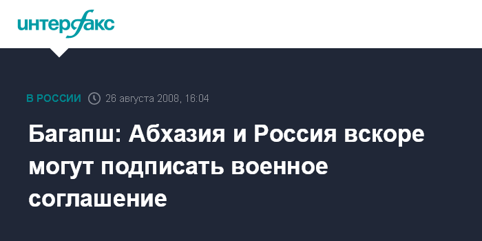 Москва. 26 августа. INTERFAX.RU - В ближайшее время может быть подписано военное соглашение между Россией и Абхазией, заявил президент Абхазии Сергей Багапш.