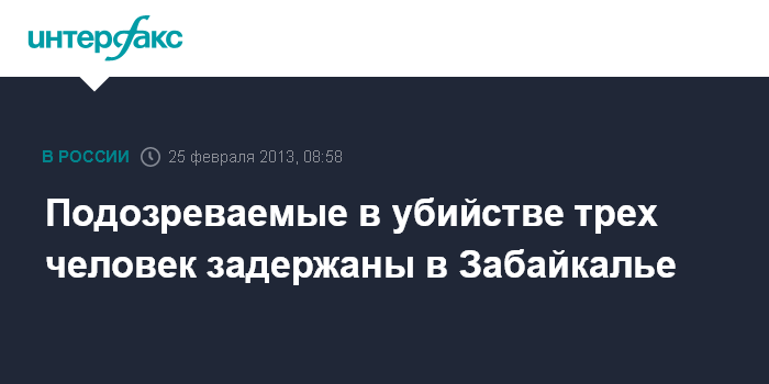 Чита. 25 февраля. INTERFAX.RU - В убийстве трех человек в селе Нерчинский Завод (Забайкальский край) подозреваются трое местных жителей, сообщил агентству "Интерфакс-Сибирь" руководитель пресс-службы СУ СКР по региону Егор Марков.