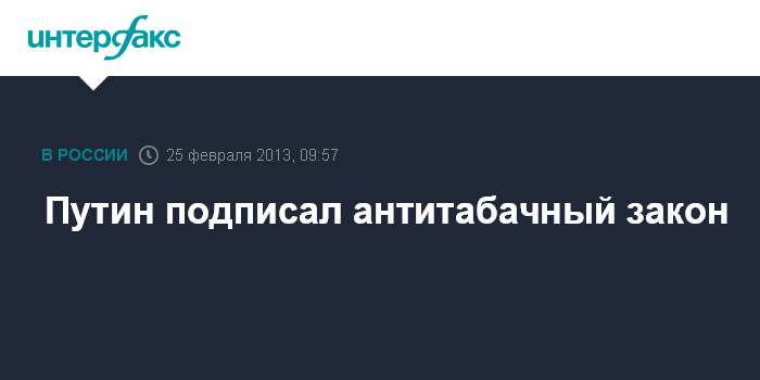 Москва. 25 февраля. INTERFAX.RU - Президент РФ Владимир Путин подписал Федеральный закон "Об охране здоровья граждан от воздействия окружающего табачного дыма и последствий потребления табака", сообщается на сайте Кремля в понедельник.