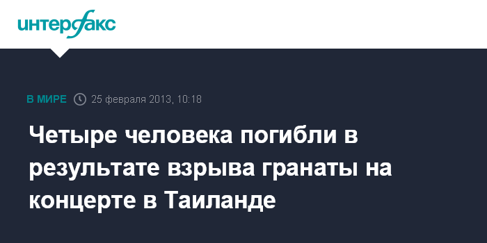 Бангкок. 25 февраля. INTERFAX.RU - По меньшей мере, четыре человека погибли и еще 50 получили ранения в результате взрыва гранаты, брошенной неизвестным на концерте таиландской группы в городе Махасаракхаме на северо-западе страны, сообщили в понедельник журналистам сотрудники местной полиции.