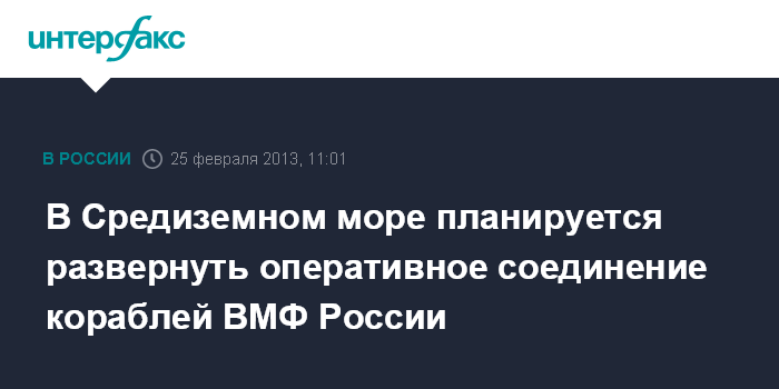 Москва. 25 февраля. INTERFAX.RU - Корабли ВМФ России с 2015 г. будут действовать в составе постоянного оперативного соединения в Средиземном море, сообщил "Интерфаксу-АВН" в понедельник источник в военных кругах.
