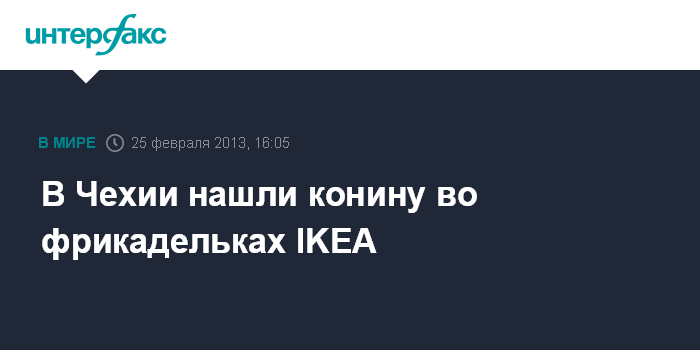 Конское мясо нашли в килограммовых пачках замороженных фрикаделек, изготовленных в Швеции из якобы говядины и свинины, отмечается в документе. В общей сложности 760 кг фрикаделек так и не попали на прилавки магазинов IKEA в Чехии.