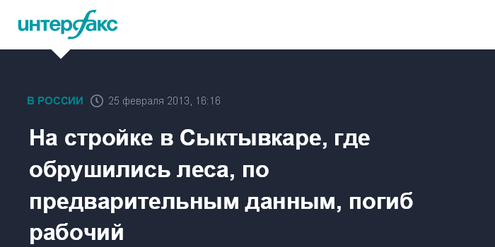 Сыктывкар. 25 февраля. INTERFAX.RU - Из-за обрушения строительных лесов на территории ОАО "Монди СЛПК" в Сыктывкаре (Коми) один рабочий погиб, сообщил "Интерфаксу" источник в компании в понедельник. "К сожалению, есть один погибший, информация по инциденту уточняется", - отметил собеседник агентства.