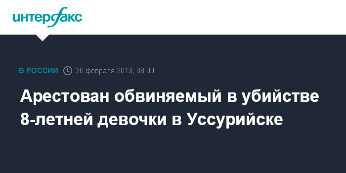 Владивосток. 26 февраля. INTERFAX.RU - Уссурийский районный суд в Приморье избрал меру пресечения в виде заключения под стражу в отношении местного жителя, обвиняемого в убийстве восьмилетней Насти Луцишиной.