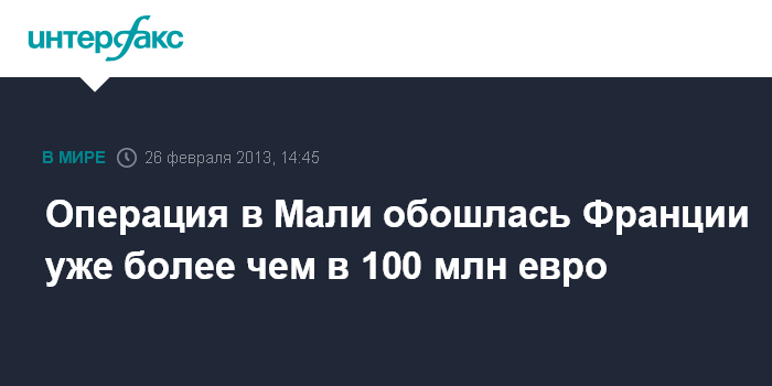 Париж. 26 февраля. INTERFAX.RU - Военная операция французских сил в Мали с середины января стоила Франции чуть более 100 млн евро, заявил во вторник министр обороны Франции Жан-Ив Ле Дриан в эфире французской радиостанции RTL.