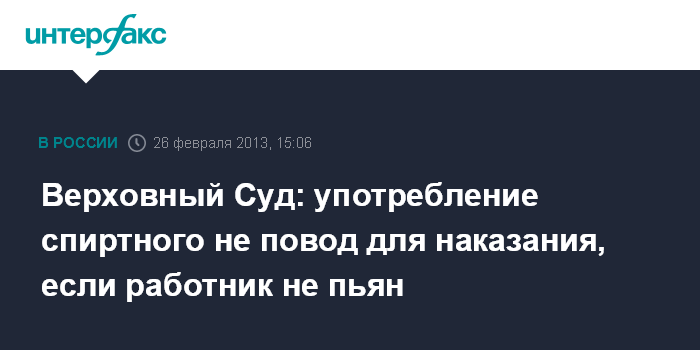 Москва. 26 февраля. INTERFAX.RU - Верховный суд России признал законным положение инструкции по медицинскому освидетельствованию, на основании которого работник может допускаться к исполнению своих профессиональных обязанностей после употребления спиртных напитков, но при отсутствии признаков алкогольного опьянения.