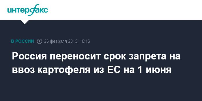Москва. 26 февраля. NTERFAX.RU - Россия переносит срок запрета на ввоз семенного и продовольственного картофеля из ЕС с 1 апреля на 1 июня.